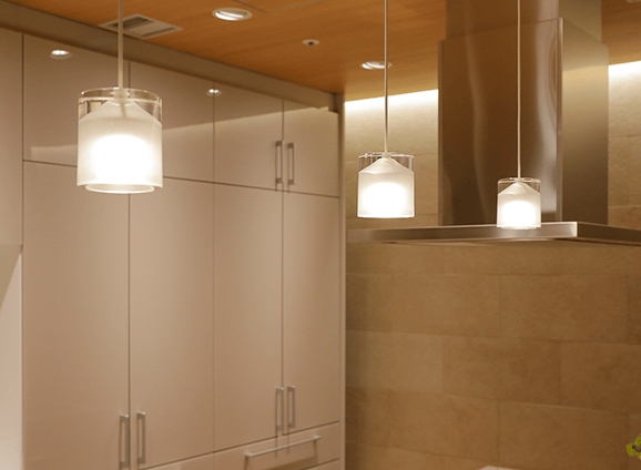 このようにシステムキッチンの上部などに小ぶりのシンプルな照明を一列に配するほか、少々大きめの個性的なデザインの照明をひとつだけ設置するなどの方法も効果的。