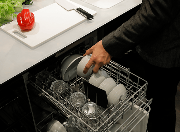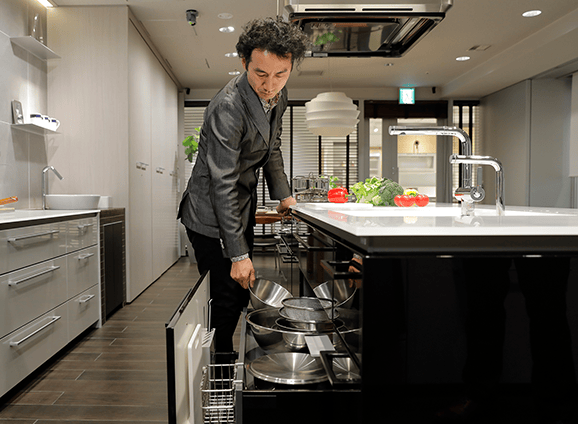 ビルトイン型の食器洗い乾燥機はカウンター下に組み込めるので、置き型と比べ、キッチンでの作業を邪魔しません。予洗いからスムーズに食器をセットできるシンク脇に配置を。