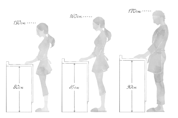 カウンターの高さは使う人の体型に合わせると、作業での身体への負担が軽減します。一般的には80~90cmの間で高さが選べるので、自分にとって最適な高さをショールームなどで把握しましょう。