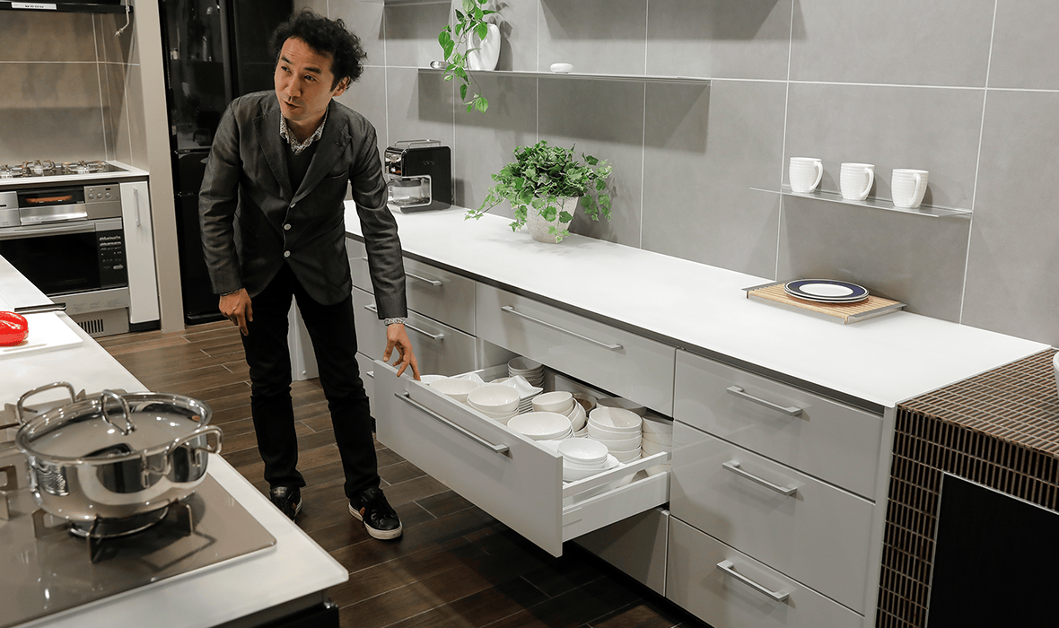 キッチンでの収納の方法で、西田さんがおすすめするのは、引き出しを活用した収納です。「カウンター下の開き戸のキャビネットは、モノの出し入れの際にかがまないといけません。これは、足腰の負担になると思います。その点、引き出しなら、立ったまま上からモノの出し入れができますし、何が入っているか一目瞭然。奥まで使い切れるので、収納量も十分です」。