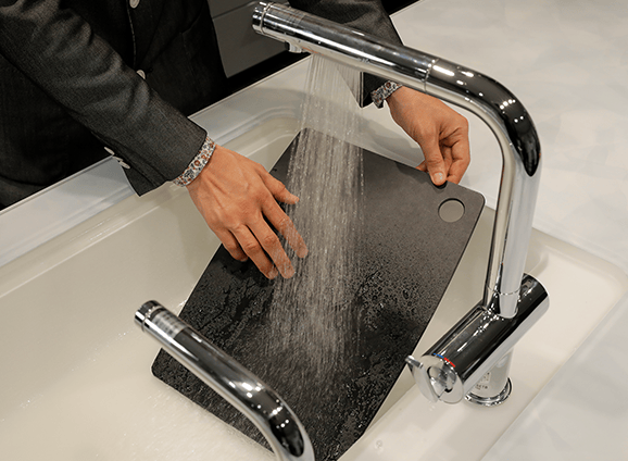 除菌成分を含む“きれい除菌水“をかけるとヌメリや黄ばみを抑えられ、キッチンワークをいつも気持ちよく行えます。