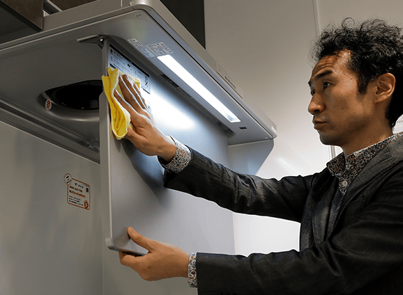 TOTO「ゼロフィルターフードeco」は、取り外すパーツは3つのみ。分解掃除も容易です。整流板は手前と奥が外れる両開き式なので、取り付けたまま、女性の方でも楽な姿勢で表も裏もお手入れできます。