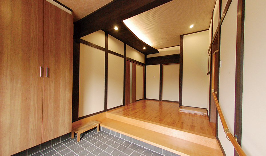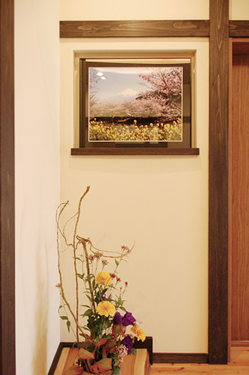 お施主様が大切にされている富士山の写真を飾るためのスペースを設けながら、玄関全体をリモデル。富士山のある方角に、額のサイズに合わせて専用のニッチを設けました。写真正面の曲線を描く天井には、雲からのぞく朝日をイメージした間接照明をデザインしています。
