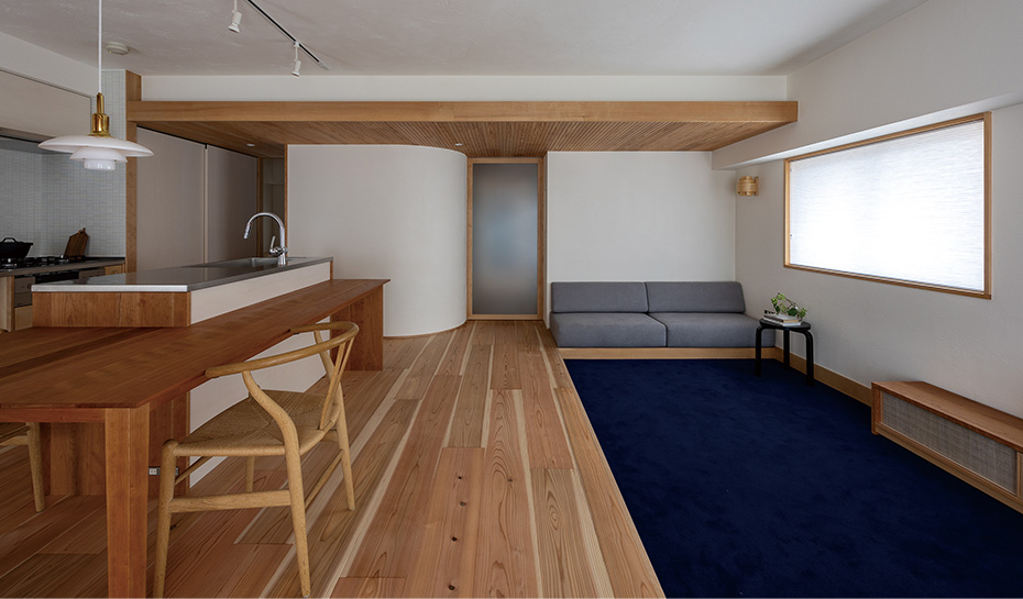 木材を使った内装が美しく、マンションリモデルには留まらない質の高い仕上がり。浴室はハーフユニットバスを採用しながら、すべてオリジナルで仕上げたような完成度。必要最低限の寝室、広々としたLDK、家事室など一人暮らしに合わせた間取りも秀逸。
