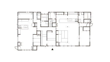 築80年以上の実家を、4世代7人が暮らす二世帯住宅にリモデル。段差や天井の低さは、母屋の床を下げることで解消。既存の梁や天井を一部残し、古民家の趣を生かした空間を実現しました。玄関と階段の位置を大きく変更し、親世帯と子世帯のスペースを振り分け。親世帯のLDKは家族が集うゆとりのスペースを確保し、折り畳みテーブルも造作しました。