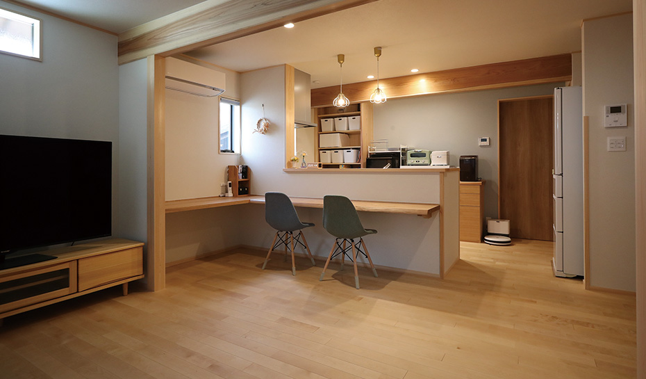 父の代からの虹梁や天井板、大黒柱を残すことができ、毎日懐かしさが感じられる一方で、広いキッチンや使いやすい造作家具、段差のない間取りで快適に過ごしています。孫たちと一緒に食事をする機会が多いので、仕切りをなくして広くしたリビングは大正解でした。4世代7人で賑やかに安心して過ごせる住まいに大満足です。
