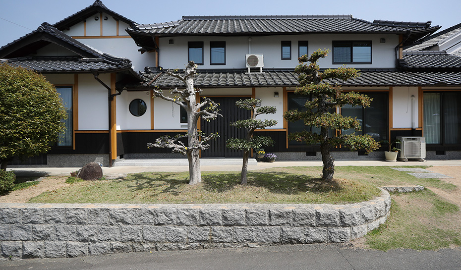 玄関を軸にした二世帯のゾーニングが巧み。親世帯、子世帯ともに、古民家の良さと現代の暮らしやすさを融合した仕上がりが見事で、ご家族の住まいへの愛着を丁寧にくみ取っている様子がうかがえます。もとの雰囲気が色濃く残る外観も素晴らしい完成度。