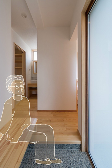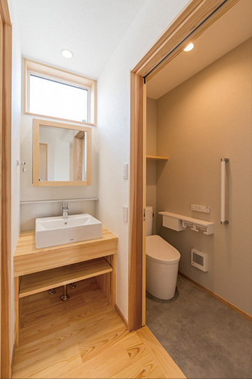 娘さんとの同居を機に、寒さや設備の老朽化などの問題を解消し、思い出の家を住み継いでいけるように整えました。浴室、洗面、トイレをまとめて配置し、動線を整理。脱衣室は大容量の収納を備えたランドリールームとして、広いスペースを確保しました。それぞれの個室はLDKと直接つなげることで、親子の時間が確保できるようにしました。
