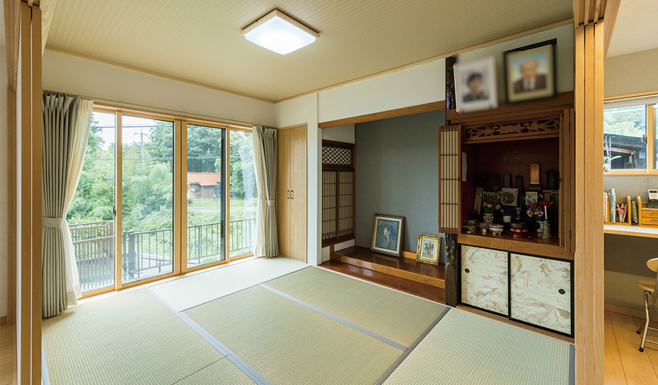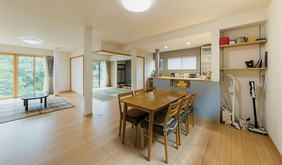 和室までLDKとして使用できる、伸びやかで心地のよい空間が広がっています。高台の緑豊かな立地のメリットも最大限に生かされたプランニングです。デッドスペースを利用した収納や、キッチンの一角に設えたデスクなど、効率よく空間を活用しています。