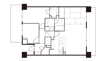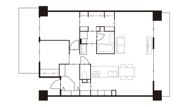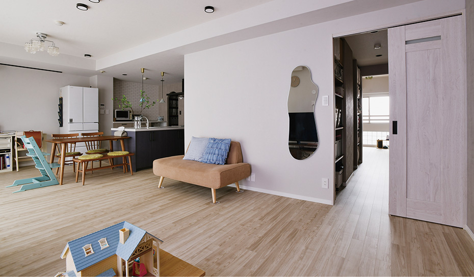 各部屋の配置は変えずに、家全体をぐるりとめぐる“8の字回遊動線”を設け、分断されている印象の間取りを改善。ドアを開け放し、光と風が住まい全体に行き渡るようにしました。あまり活用されていなかった和室はリビングに取り込み、LDKのスペースを拡張。キッチンは向きを変えてゆとりを持たせ、配膳や片付けをスムーズにしました。