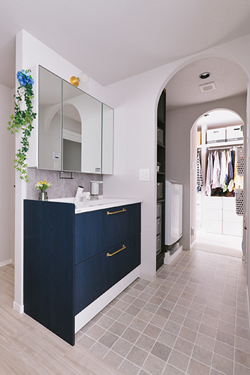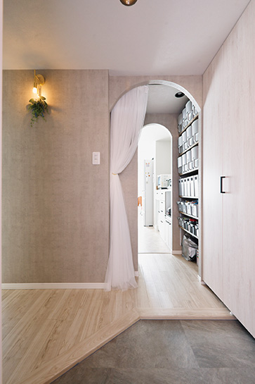 ぐるりと回れる動線や広々としたキッチン、ウォークスルー収納など、日々の暮らしが本当に快適になりました。キッチンもゆとりがあり、今では子どもと一緒にお菓子作りを楽しんでいます。収納は扉の開け閉めもなく、移動しながらサッと物を出し入れできるので、家中が自然と整い、日々の家事も早く終わるようになりました。片付け場所がわかりやすく、子どもも片付けが上手になりました。デザイン面も理想通りで、グレーを基調とした落ち着いた雰囲気や、アーチ壁のやわらかさに大満足しています。