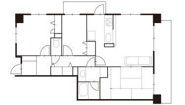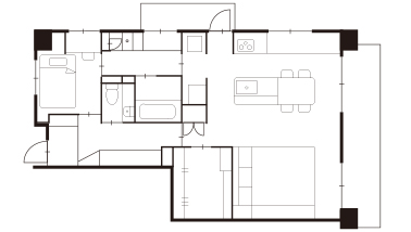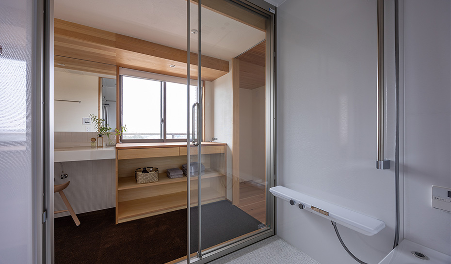 3方向に開口があり、暑さ、寒さが厳しいマンション最上階。全体的に断熱施工を施すとともに空気を循環させる換気設備を備え、温度や湿度の環境を整備しました。水まわりは中央に配置して南北へ通り抜けられる動線を確保し、眺望を生かしたプランに。浴室にはガラスドアを採用し、洗面室の窓から空を眺めて入浴できるように配置しています。