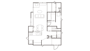 ご夫婦2人がそれぞれの趣味を楽しめるように空間を設計しました。細かく分かれていた部屋を一体化し、廊下もなくして空間を広く活用。ご主人の趣味のロードバイクは玄関に壁掛けし、手入れできるスペースを確保しています。大画面のテレビをキッチンから眺められる位置に設置し、奥様がライブ映像をいつでも鑑賞できるようにしました。