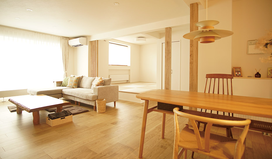 既存の良さを生かしながら中古住宅をリモデル。独立していたキッチンをリビングと一体化し、対面式のLDKに。隣接する和室も間仕切りをなくして小上がりに変更し、さらに広がりを持たせました。玄関ホールの階段の壁面を覆う木のパネルはそのまま生かし、思い出のダイニングテーブルを玄関の敷台としてリメイク。温もりに包まれた空間に仕上げました。