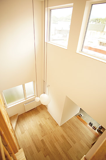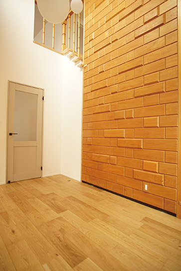 木のパネルをそのまま生かした玄関ホールをベースに、開放的なLDKもイメージが統一され、優しい印象の空間が広がっています。小上がりの和室、2階のフリースペースなどゆとりを持たせた空間づくりが、毎日の暮らしに彩りを添えてくれそうです。