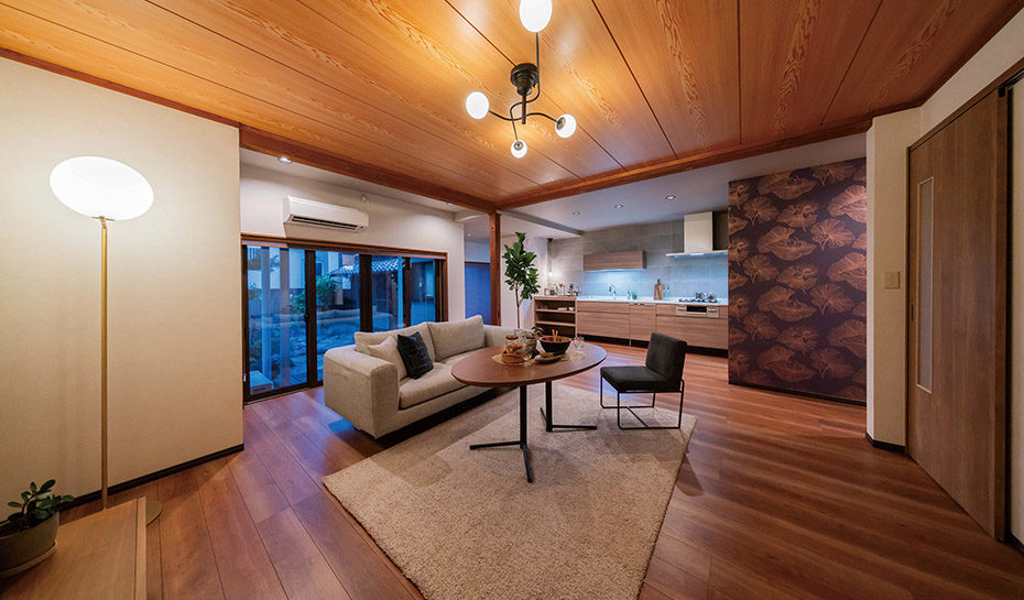 古民家ならではの趣の中に、現代的な快適性を融合。大空間のリビングダイニング、壁紙や組子のあしらいなど、遊び心の感じられる個性的な住まいに生まれ変わりました。耐震補強や断熱改修も施され、住まい全体の性能も高められています。