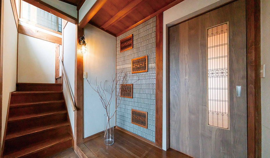 築70年の古民家を、既存の良さを残しながら快適に暮らせる住まいへ。和室とダイニングを一体化し、大空間のリビングダイニングに。キッチンと隣接してパントリーを設け、冷蔵庫をその中へ収めました。玄関ホールは“住まいの顔”として捉え、組子建具をタイルと組み合わせて壁面デザインに再利用。伝統とモダンが調和する空間を目指しました。