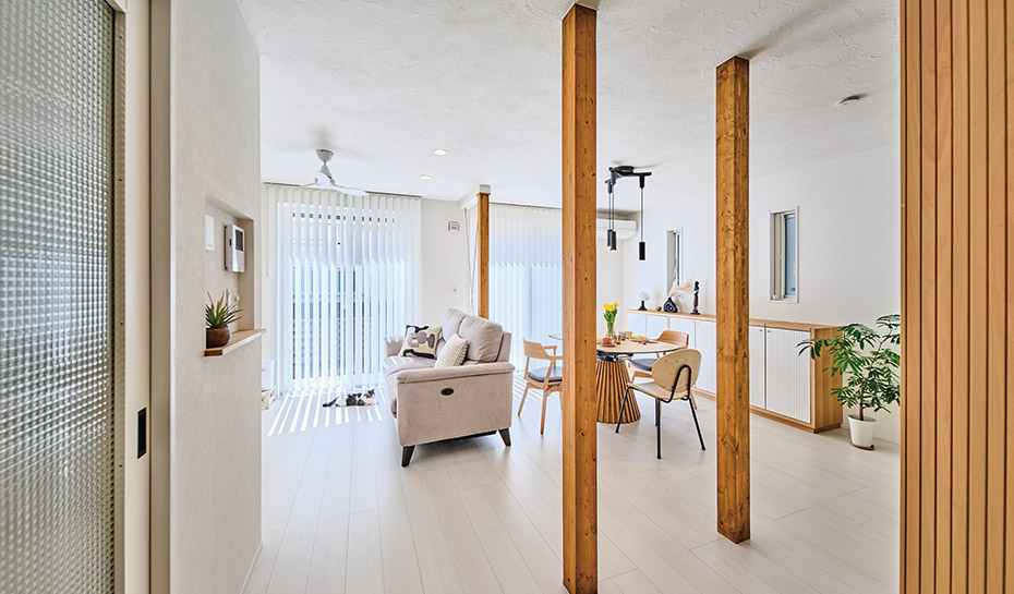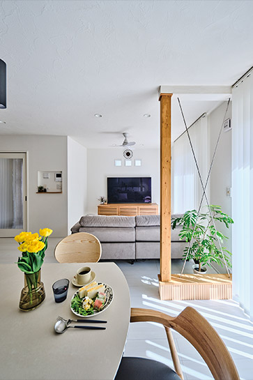 キッチンと水まわりをコンパクトに配置し、家事効率を向上させた間取りが巧み。サッシ交換、断熱材以外に、窓の位置も計算した断熱性能の向上や、白を基調にしたインテリア、収納の工夫など、快適な住まいを実現するためのポイントが詰まっています。