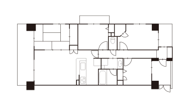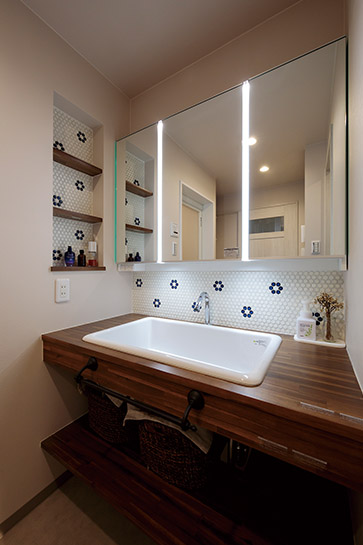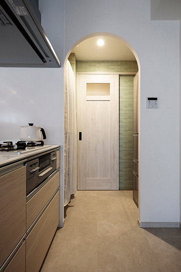 マンション空間をお施主様の理想の空間へと変身させたアイデアが光ります。照明を兼ねた化粧梁がアクセントとして機能。キッチンに隣接したパントリーは洗面脱衣室にも通じていて水まわりの回遊動線を確保するなど、家事効率も向上しています。