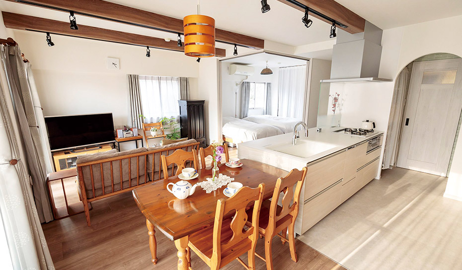 和室を取り込み、LDKを拡張。コーナーの2枚引戸で洋室を間仕切りし、ご夫婦の寝室に。来客時や就寝時以外は開放して、LDKと一体化して使用できるようにしました。お施主様が憧れていた梁のある天井を実現するため、化粧梁を造作。照明のダクトレールを組み合わせ、梁の中へ配線を隠しました。洗面台もお施主様のお好みに合わせて造作しました。