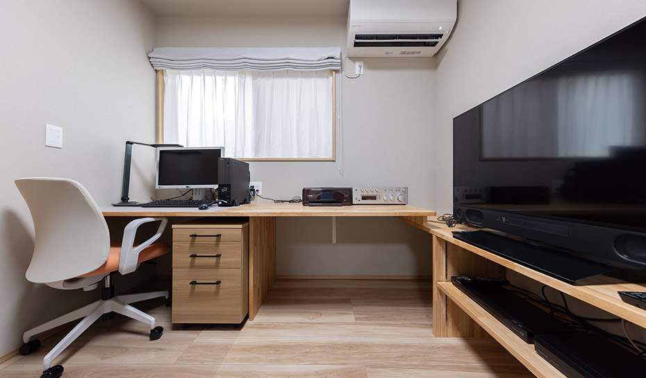 地震への対策や体への負担を考えて、平屋にリモデル。さらに1階も一部減築して2台分の駐車スペースを確保し、玄関への段差を減らして手すりを設置するなど安全性を高めました。室内はこれまでと生活リズムが変わらないように間取りを計画。趣味の映画鑑賞を今まで同様に楽しめるように、PCスペースとテレビの配置を工夫しました。