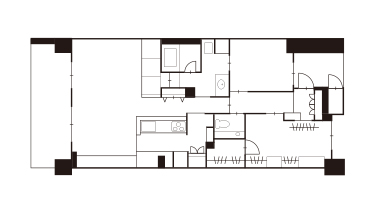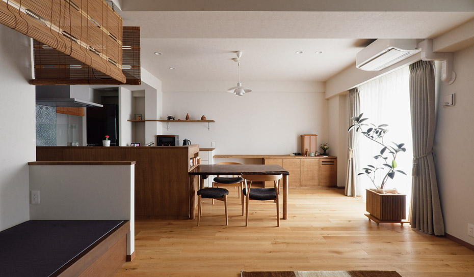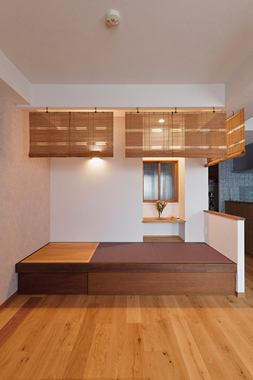 洋室をLDKに取り込み、広々とした空間に。一角に小上がりを設け、実家で使用されていたすだれを目隠しに活用。ゲスト用の寝室としても利用できるようにしました。小上がりには室内窓を設けて通風を確保。回遊動線を取り入れてさらに通風に配慮するとともに、使いやすさも両立させました。洋室をクローゼットとして整え、衣類の収納力を高めています。