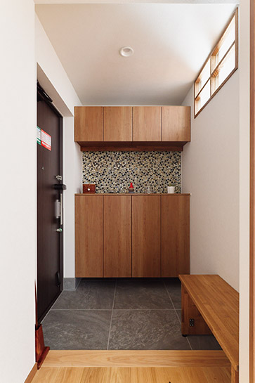 南北に開口のある住居ですが、回遊動線と適所に設けた室内窓で通風を綿密に計画。玄関など暗くなりがちな空間に光も届き、心地よさを生み出しています。LDKの小上がりは収納も兼ねた便利なスペース。毎日の生活にくつろぎをもたらしてくれそうです。