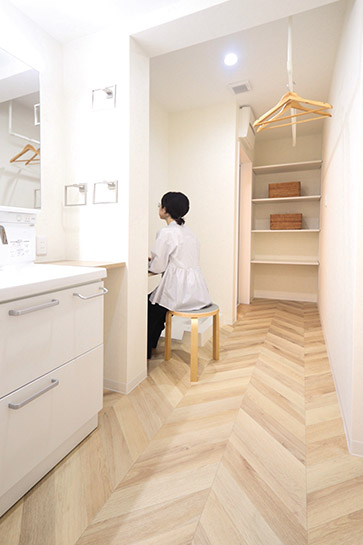 ウナギの寝床のような築100年の古民家。当初は2階リビングを計画しましたが、階段の負担を考慮し、1階を生活の中心に。人通りの多い南面は避けて北側にリビングを配置し、2階のベランダを撤去して採光を確保。畳スペースを設けて、将来的には間仕切りできるように整えました。洗面室は座って身支度できるカウンターも備えています。