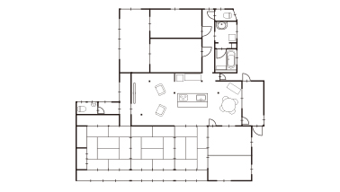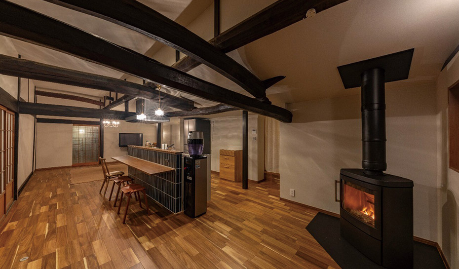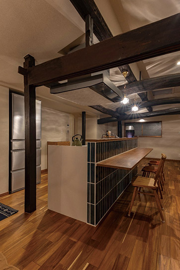 友人やお客様が気軽に集まれる場所として、築100年の古民家をリモデル。3部屋をつなげて広いLDK空間を創出し、アンティーク調のタイルで仕上げたカウンターキッチンを主役に据えました。古民家ならではの太い梁を見せ、天井の高い開放的な空間に。外せない柱もアクセントにしました。薪ストーブを設置し、温もりのある空間に仕上げました。