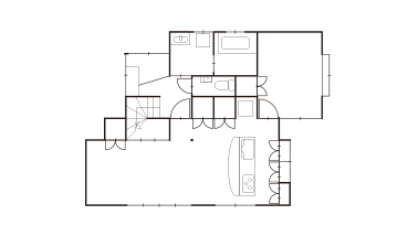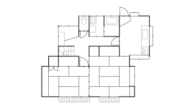 和室2間を一体化してLDKに変更し、対面式キッチンに。家事をしながら家族とコミュニケーションが取れるようにレイアウトしました。出窓のサイズを小さくしてキッチン背面の収納スペースに活用。冷蔵庫はキッチンとダイニングの双方から取り出しやすい位置に配置しました。既存の床の間と押入れは、開き扉の収納に造り替えています。