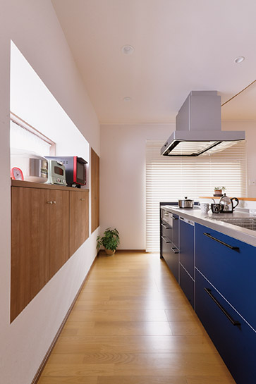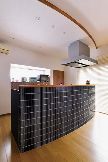 広々としたLDKにより、生活のしやすさが向上。キッチンの背面収納や冷蔵庫の配置など、巧みにスペースを活用しています。キッチンカウンターや下がり天井のカーブが空間に変化と優しさをプラス。ネイビーのタイルがアクセントとして機能しています。