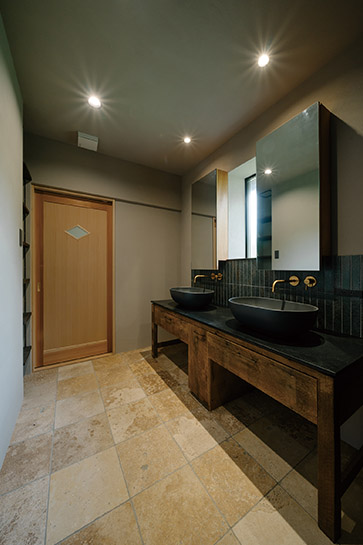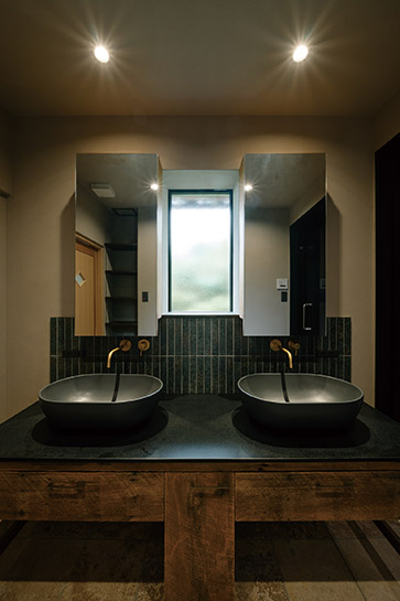 築165年の家を受け継ぎ、思い出と歴史を大切に親戚が集う拠点として再生。玄関に面していた洗面室と浴室はスペースを拡張し、DKから出入りする動線に。浴室は断熱施工とともに窓を小さくして快適に入浴できるよう改善しました。2ボウルの洗面台を造作した洗面室はダークグレーで浴室と統一し、非日常感のあるデザインを目指しました。