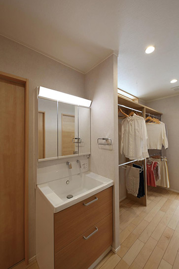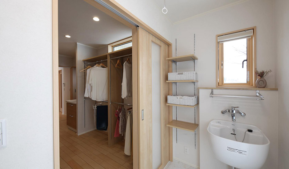 脱衣室、サンルーム、ウォークスルークローゼットと、洗濯の流れに沿って機能的に配置されたレイアウトが見事。LDKからつながるウォークスルークローゼットには洗面台も設置されていて朝の身支度もスムーズにできるなど、考え抜かれています。