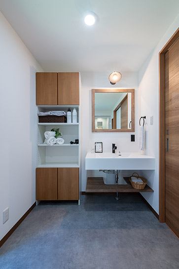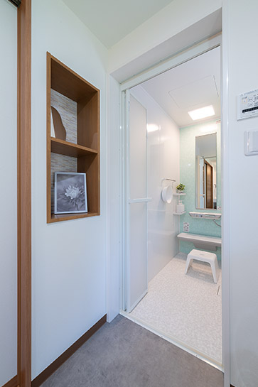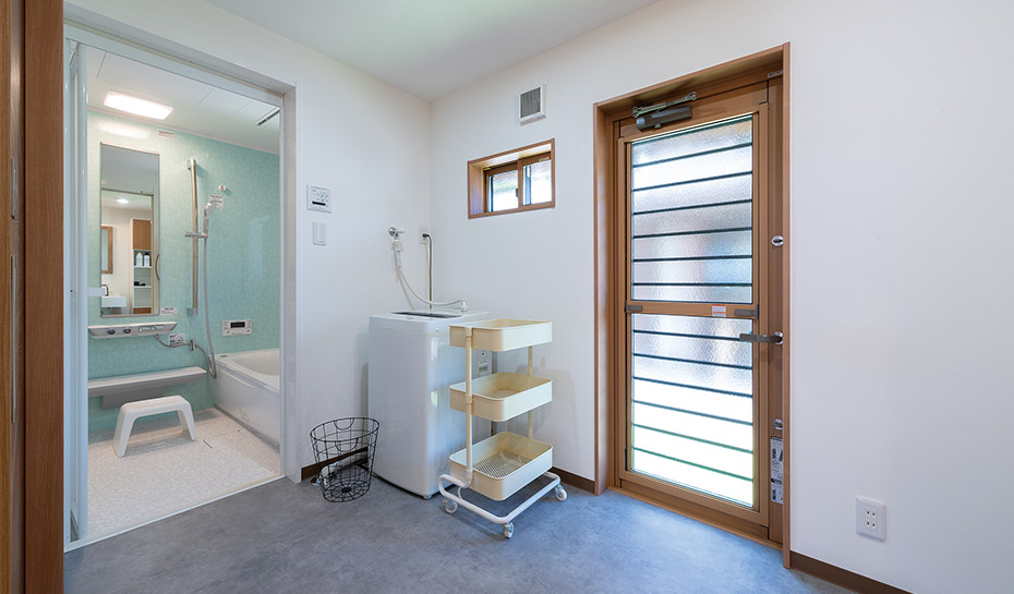 水まわりへのアクセスを重視した使いやすい間取りです。洗面脱衣室はお子さんと使用しても十分なゆとりがあり、さらに勝手口を設けたことで家事動線も向上。浴室の出入口横に設えた着替えやタオルを置くニッチも、利便性を高める良いアイデアです。