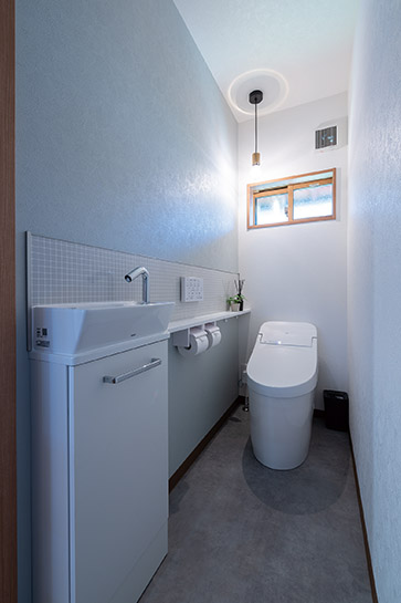 浴室が玄関土間を経由する位置にあったため、住まい全体の間取りを見直し、LDKから直接アクセスできる配置にしました。洗面脱衣室は空間を広く確保し、幼いお子さんと入浴しやすいように配慮。勝手口を設けて洗濯動線をスムーズにするとともに、庭での水遊び後にすぐシャワーを浴びられるようにしました。トイレも隣接し、利便性を向上させました。