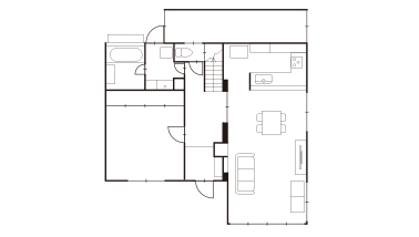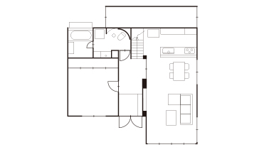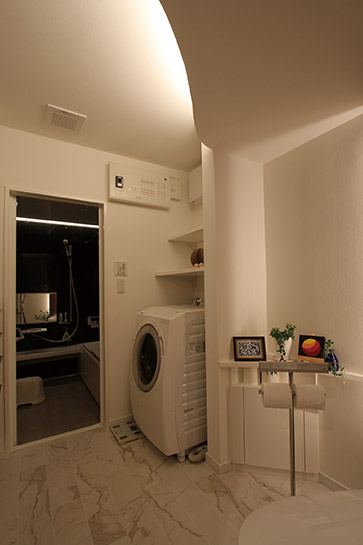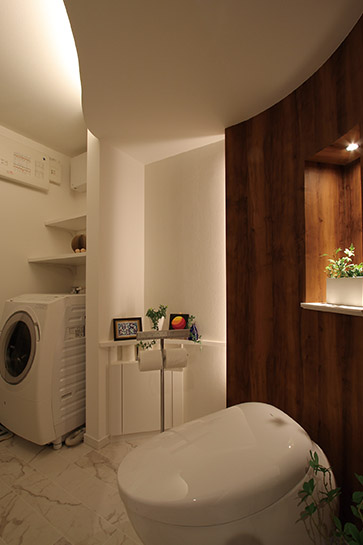 夫婦二人暮らしなので開放的でおしゃれな空間にしたいというご要望を受け、隣接する洗面脱衣室と一体化して広いサニタリー空間を提案。曲線が美しい便器に合わせてアール状の造作壁を設け、造作壁の両脇と下がり天井に間接照明を設置しました。便器は45度の角度をつけて設置。洗面脱衣室にあった勝手口は塞いで洗濯機置き場にしました。