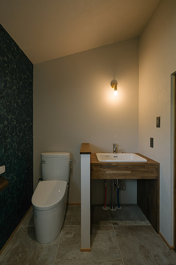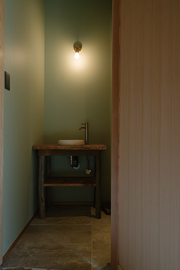 165年の古民家の魅力を地域の方々にもアピールできるように、「おもてなしトイレ」をテーマに、玄関土間から直接入れる位置にトイレを新設。古材の柱に合わせて、手洗台も古材で造作し、床にはアンティーク調の大判タイルを採用しました。日常用として、トイレ、洗面、シャワールーム、洗濯スペースを集約した多機能スペースも設けました。