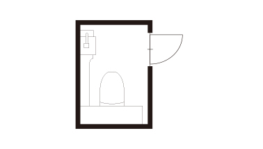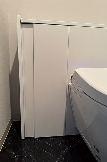 既製品を組み合わせてお施主様の理想の空間に近づけた、真摯な姿勢が感じられる作品です。気に入っていたリモデル前のトイレとほぼ同じ配置を再現し、収納もキープ。壁の一面に施工した壁材がアクセントとなり、シンプルな空間に変化を与えています。