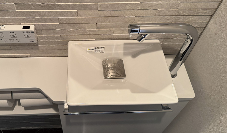 お施主様が気に入っているトイレでしたが、故障した便座を交換するには一体となっている便器、収納ごと変更する必要がありました。手洗器は別、収納は必須という条件に合わせて、レストパルFを採用。気に入ったデザインの手洗器を設置するにはすき間が生じてしまうため、排水心を移動して解決。壁には凹凸のある壁材を張り、高級感を演出しました。