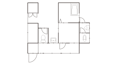 タイル張りのトイレをリモデル。ユーティリティー部分までスペースを拡張するため解体してみると、想定外の柱とブロックが出現。その凹凸を生かして、便器の背面に壁面収納を設えました。トイレットペーパーを収納できるサイズに設定し、掃除用のブラシも収納しやすいように。FIX窓も設置して、光を取り込みました。