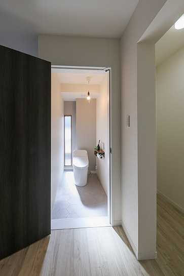 想定していなかった柱を活用した収納が良いアイデア。出し入れしやすいオープン棚ですが、収まりが良く見た目もスッキリ。内装もシンプルにまとめられていて、便器背面の壁に設けたFIX窓から差し込む光が明るく、温かみを感じさせます。
