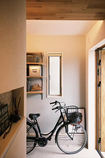 趣味のキャンプグッズや自転車のスペースを確保するため、リビングに隣接する和室の一部と押入れを取り込み、玄関土間を拡張。和室は狭さを感じさせないように、玄関土間との間にガラス戸を採用し、玄関までつながりのある空間に。玄関土間には可動棚を設置して、キャンプグッズを収納しやすいように工夫しました。