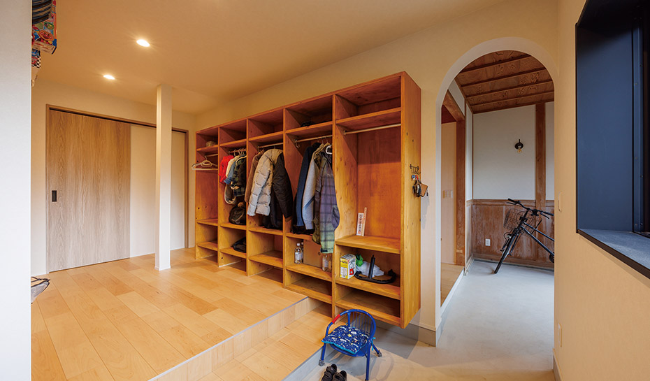 築60年の古民家の風合いを残しながらリモデル。広い玄関土間から各部屋につながる間取りで段差がバラバラだったため、床のレベルを合わせてバリアフリーに。玄関に隣接する洋室は大容量のシューズクローゼットと玄関収納に変更しました。家族一人ひとりの個人ロッカーも造作。天井や腰板は既存を生かして、印象的なエントランスに仕上げました。