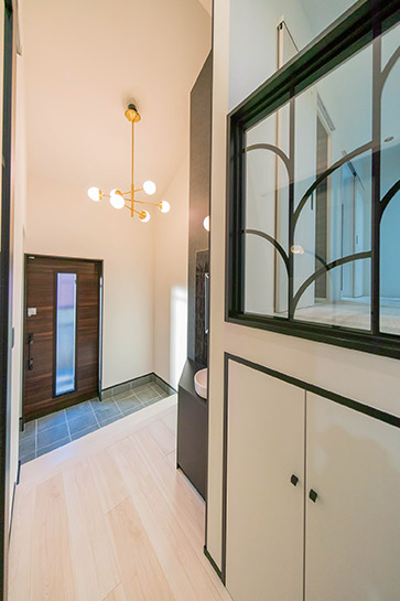 洗面コーナーが“玄関の顔”として存在感を示しています。大容量の土間収納を設けたことでスッキリ片付けられ、美しい状態をキープすることが可能に。玄関正面のロフトも空間のデザインに取り込み、天井高の開放感を効果的に演出しています。