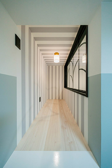 広さはあるものの、収納が不足していた玄関。和室の収納を取り込み、ベビーカーやアウター、アウトドア用品などを収められる土間収納を新設しました。帰宅後すぐ利用できるよう設けた洗面コーナーは、ブラックを基調にタイルを組み合わせ、品の良い印象に。階段の手すり壁やロフト部分にはオリジナルパネルを採用し、光が取り込めるようにしています。
