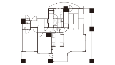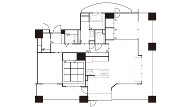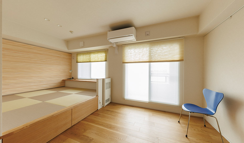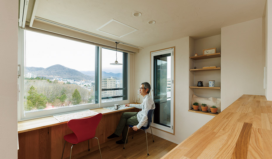 マンション最上階の角部屋をご夫婦の終の棲家としてリモデル。自然豊かな眺望を楽しめるように、ダイニングにカウンター、リビングにヌックを窓際に設けました。キッチンも配置を変更し、調理中に外が眺められるようにしています。寝室は小上がりの和室にして、下部を収納として活用。廊下にクローゼット、玄関に土間収納など収納力も高めました。