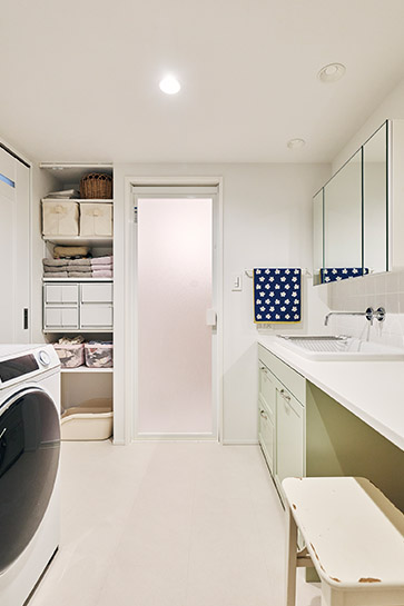 家事負担の軽減を目指し、隣接する洋室を一部取り込んで洗面脱衣室を拡張。ランドリールームとしての機能も持たせました。洋室はウォークインクローゼットに変更し、直接出入りできる間取りに。乾燥機や室内干しで乾かした洗濯物を片付けやすいように考えました。洗面台は実験用シンクを使用して造作し、座って作業できるカウンターも設置しました。