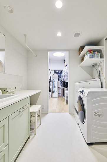 洗濯の効率化を考えて丁寧にプランニングされています。スペースを拡張し、洗濯機と大型乾燥機の設置場所を確保。さらに収納の動線も最短ルートで設計されていて、家事負担を軽減してくれそう。カウンター付きの造作洗面台は、デザイン面、機能面ともに優れています。