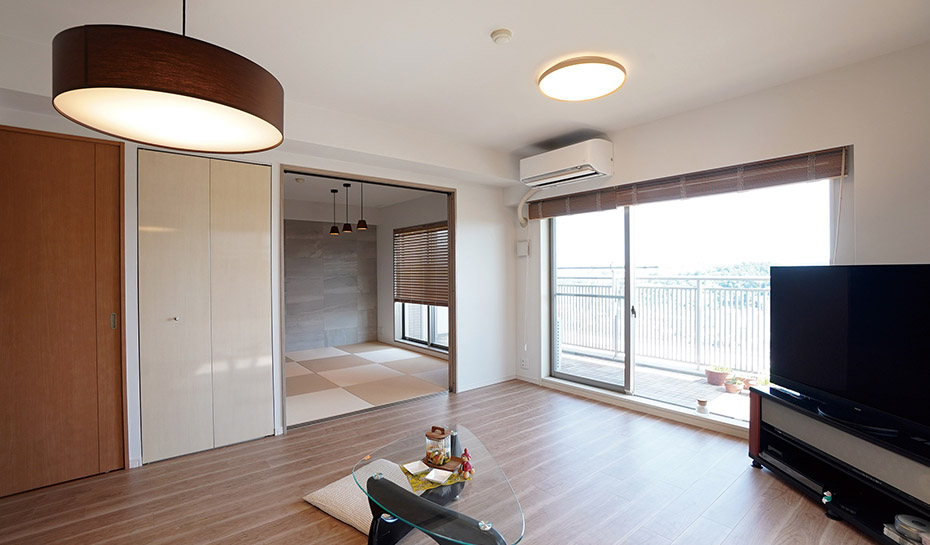 老朽化した水まわりを中心に、小さな不満の数々を解消。共働きのご夫婦のため、家事の負担を軽減する機能を搭載した設備機器をセレクト。開き扉が多く、無駄なスペースが多いキッチンは、ご夫婦一緒に作業がしやすいように動線と収納力を考えてプランニング。リビングに隣接した和室はグレーの調湿タイルと琉球畳で和モダンな印象にまとめました。