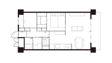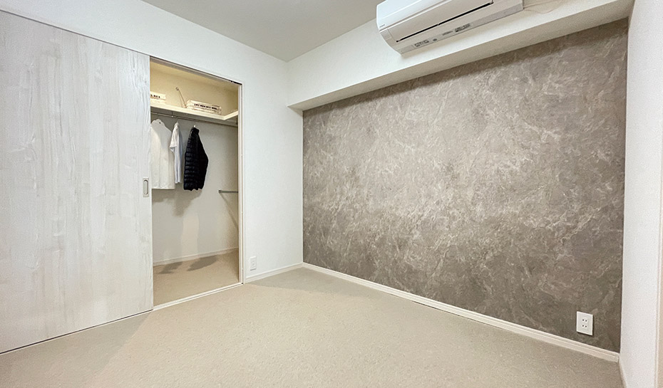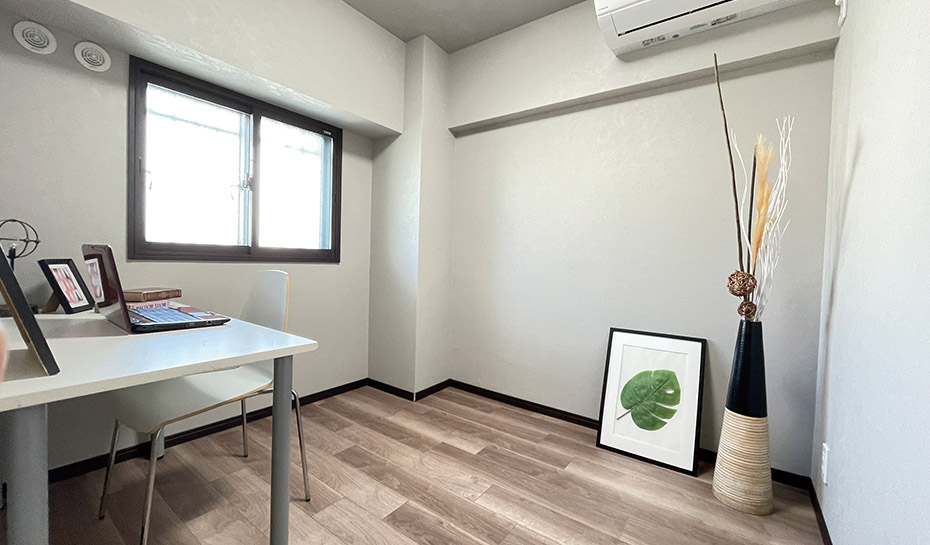LDKと和室を一体化し、ゆとりのあるくつろぎの空間に。露出していたエアコンダクトを垂れ壁で隠し、間接照明を設置。凹凸のある壁材を一面に採用し、間接照明の温かい光が照らすように組み合わせました。在宅ワーク用の仕事部屋は、寝室との間にウォークインクローゼットを設け、物音などが気にならないよう配慮しています。